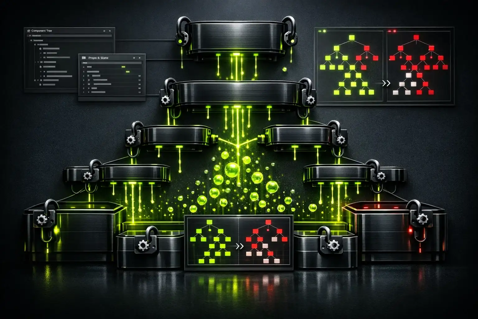 Niet-opgeruimde event listeners. Niet-geannuleerde subscriptions. Closures die referenties vasthouden. 80% van React-apps hebben memory leaks die de performance progressief verslechteren. We gebruiken WeakRefs, AbortControllers en strikte cleanup-patterns. Profiling met Chrome DevTools bij elke release.